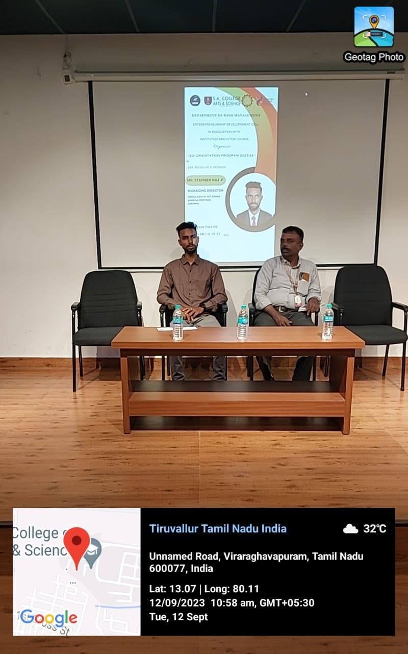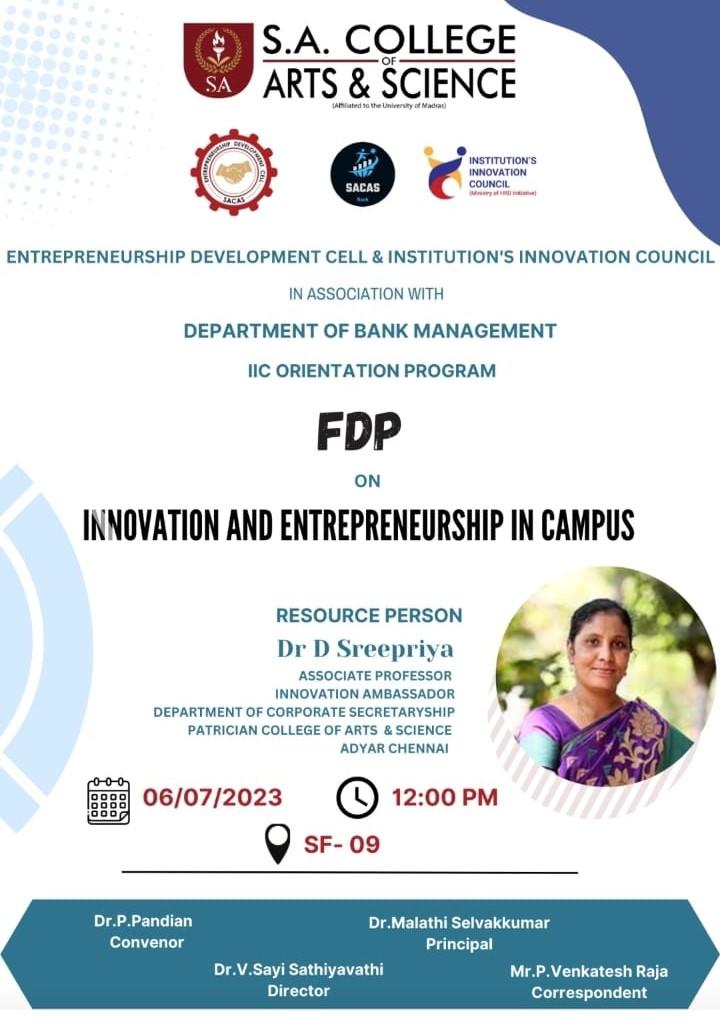 The Entrepreneurship Development Cell and the Department of Bank Management of S.A. College of Arts & Science, in association with the Institution Innovation Council, organized the “ED Orientation Program 2023–24.”