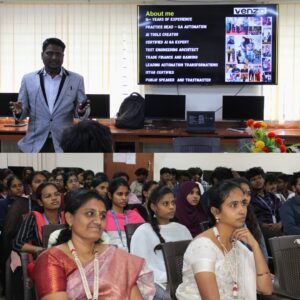 The Department of Computer Science with Artificial Intelligence, at S.A College of Arts & Science, successfully organized a Guest lecture titled “Make Yourself Irreplaceable – Powered by AI Skills” on 07/01/2026. The session was delivered by Mr. Arun Charles, QA Automation, Venzo Technologies, who shared valuable insights into the fundamentals of Artificial Intelligence.