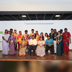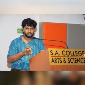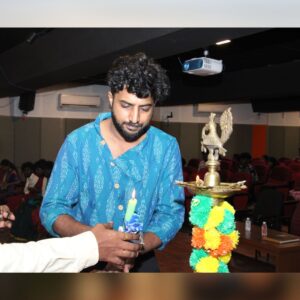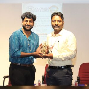 The highlight of the event was the presence of guest speaker Mr. S. Aravinth, Actor and Creator. He shared valuable insights on live arts, emphasizing the importance of expression, timing, and connection with the audience. He also spoke about his journey in theatre, acting, and content creation, inspiring students with practical tips and real-life experiences.