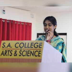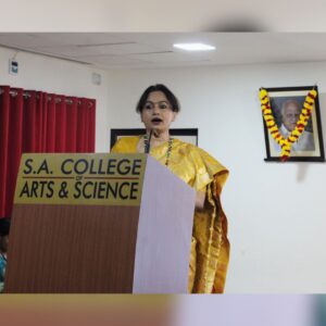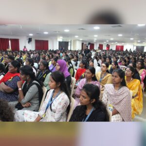 The programme commenced with an invocation, followed by a welcome address by Ms. Afsin P. M. of II BCA. The Chief Guest, Dr. Mala Raj, Obstetrician and Gynecologist from M D Firm Hospitals, was felicitated by Mrs. Saveetha Venkatesh Raja.