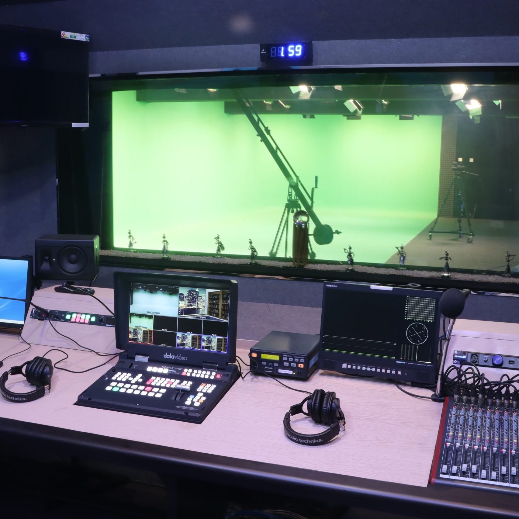 Audio Recording "Achieve the perfect mix with our advanced 7.1 audio mix technology." Green & Blue Matte Studio "Get Ready to Create Magic…
