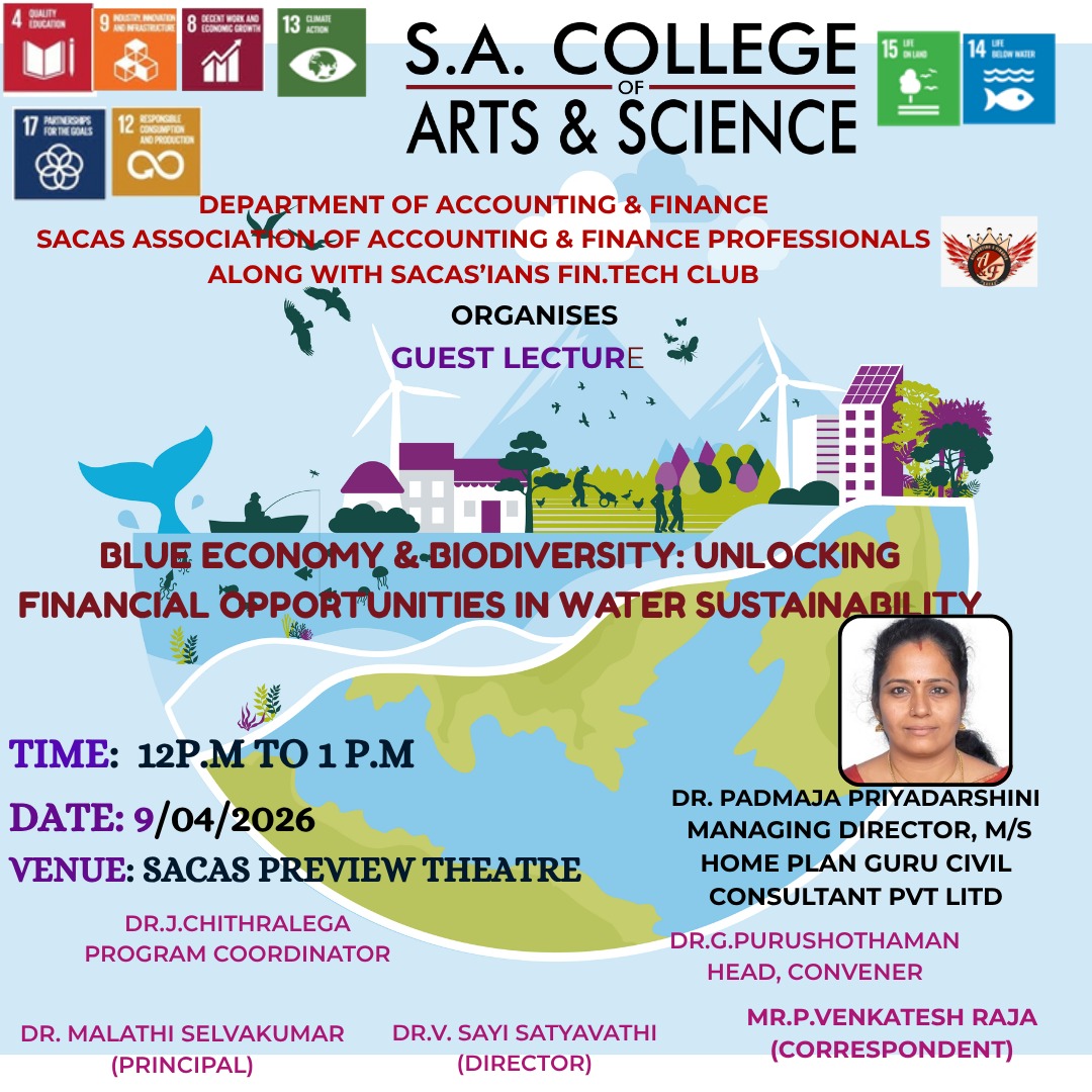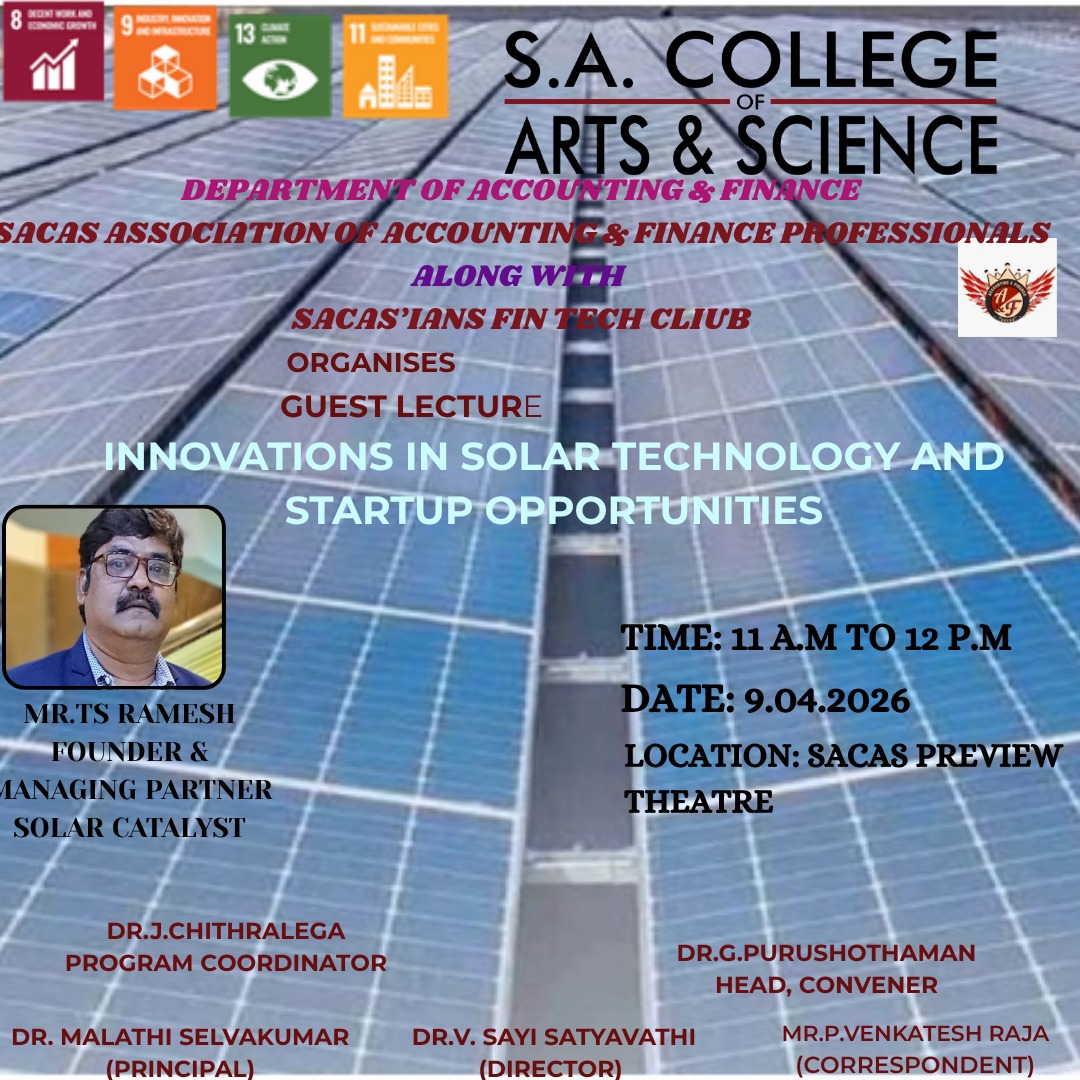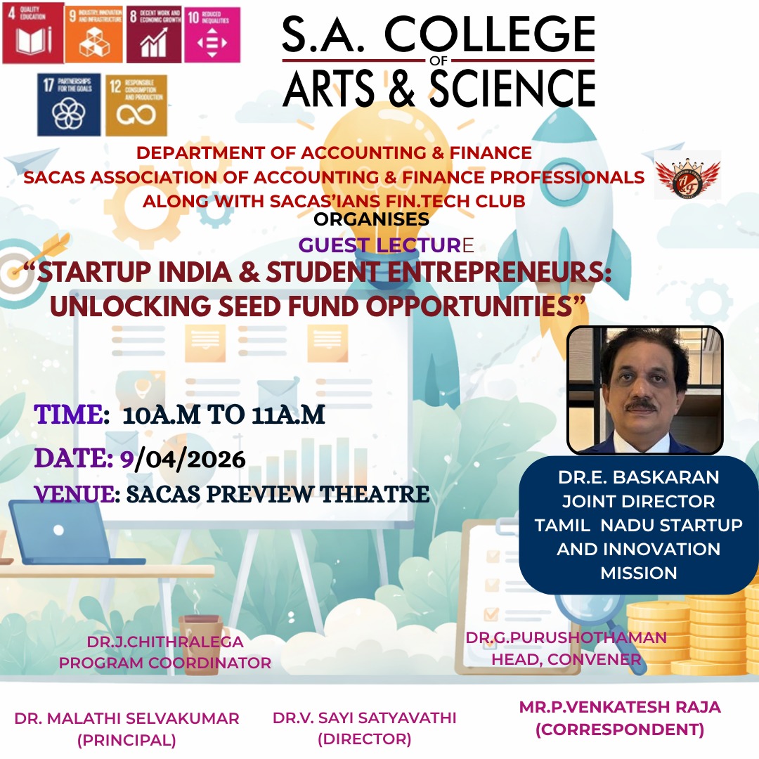 Department of Commerce (Accounting & Finance), S.A. College of Arts & Science, in association with the SACAS Association of Accounting & Finance Professionals and the SACAS’IANS FinTech Club, is organizing a guest lecture on 09.04.2026