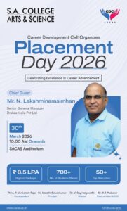 The Career Development Cell of S.A. College of Arts and Science (SACAS) proudly presents Placement Day 2026, a prestigious occasion dedicated to recognizing the outstanding placement achievements of our students. This event reflects the institution’s commitment to academic excellence, strong industry collaboration, and holistic student development, bringing together students, faculty, recruiters, and industry leaders to celebrate success and inspire future career pathways.
