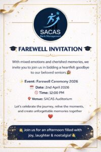 The Department of Bank Management, S.A. College of Arts & Science (SACAS), will organize the Farewell Ceremony 2026 on 2nd April 2026 at 12:00 PM in the SACAS Auditorium. The event will be conducted with the objective of extending a warm and memorable farewell to the outgoing students, while recognizing their academic journey, achievements, and valuable contributions to the department.