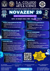 The Department of Computer Science with Artificial Intelligence at S.A. College of Arts & Science is organizing an Inter-Collegiate Technical Fest titled “NOVAZEN’ 26” on 05th March 2026 from 9:00 AM to 4:00 PM at the SACAS Auditorium.
