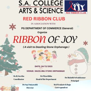 The Red Ribbon Club (RRC), in association with the PG Department of Commerce (General), is organizing a social service visit to Dazzling Stone Orphanage , Kundrathur on 24 December 2025, from 9:00 a.m. to 1:00 p.m .