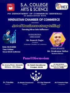PG Department of Commerce (General), S.A. College of Arts & Science, in association with the Hindustan Chamber of Commerce, will organize an academic programme titled “Art of Business Storytelling: Turning Ideas into Influence” on 02 March 2026 at 11:00 a.m. in the SACAS Auditorium. The event will highlight the importance of storytelling as a strategic tool in contemporary business communication and leadership.