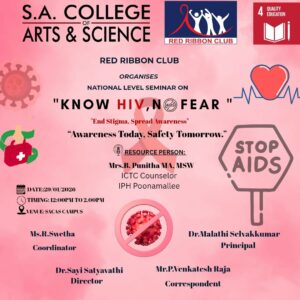 The Red Ribbon Club of S.A. College of Arts & Science is organizing a National Level Seminar on HIV/AIDS Awareness titled “KNOW HIV, NO FEAR ” between 12.00 pm to 2.00 pm at SF14 with the aim of educating young minds about HIV, breaking myths, and eliminating stigma associated with the disease.