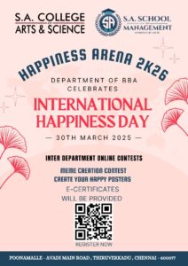 The School of Management ,Department of Business Administration is celebrating International Happiness Day on 30th March 2026 at SACAS . Interdepartment competitions are also organized on account of Happiness Day.