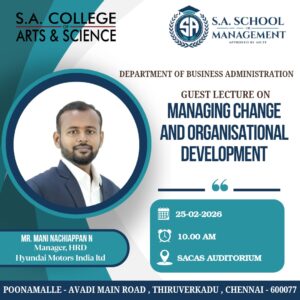 The School of Management ,Department of Business Education , is organising an expert lecture on 25th February 2026 on “Managing Change and Organisation Developmet” at SACAS Auditorium . The Resource person for the session is Mr.Mani Nachiyappan.N, Manager ,HRD,Hyundai Motors India.