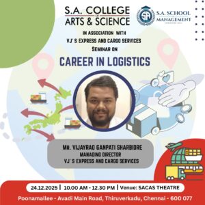 The School of Management in association with VJ’S Express and Cargo Services is organisation seminar on Career in Logistics on 24.12.2025 at 10.00 am on 24.12.2025 at SACAS Theatre.