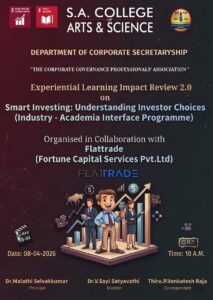 The Corporate Governance Professionals Association, under the aegis of the Department of Corporate Secretaryship, in collaboration with Flattrade and Fortune Capital Services Pvt. Ltd., is organizing the “Experiential Learning Impact Review 2.0 on Smart Investing: Understanding Investor Choice (Industry–Academia Interface Program)”On 8th April 2026 at 10:00 a.m. at S.A. College of Arts and Science.